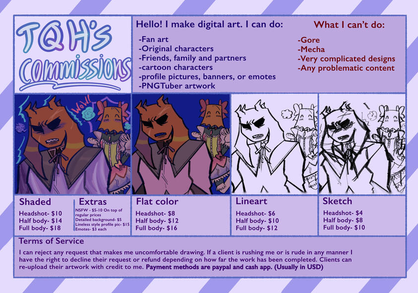 If I am halfway done with your commission and you want a refund I will give half back. No refunds if I completed your project.